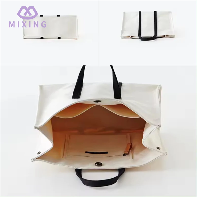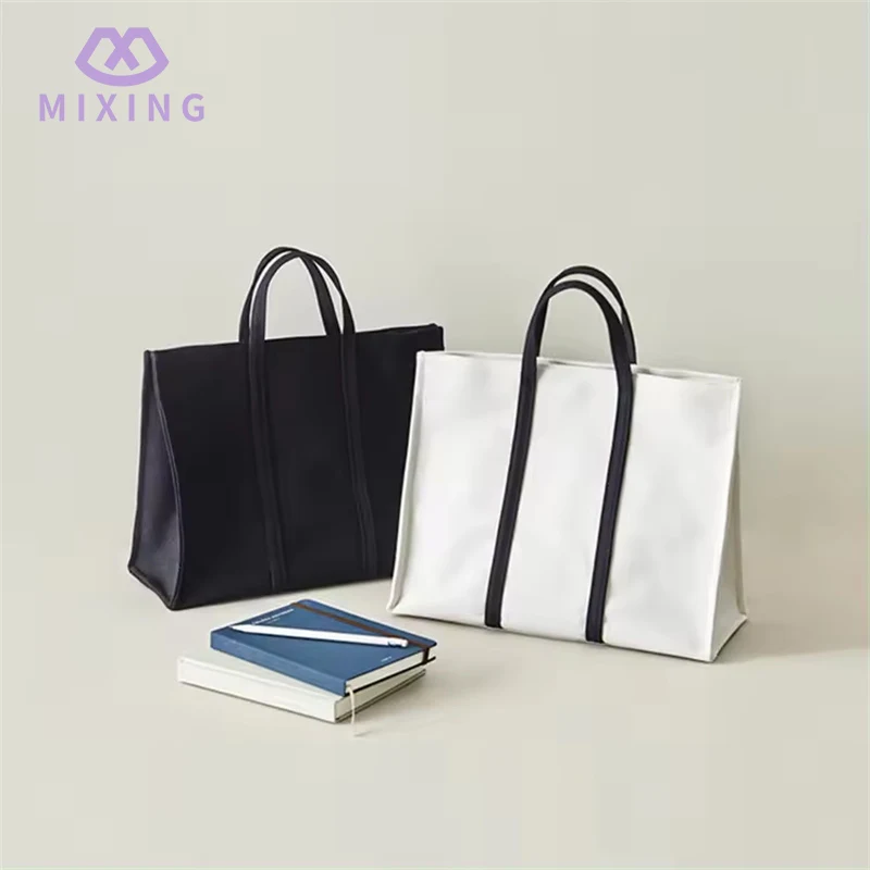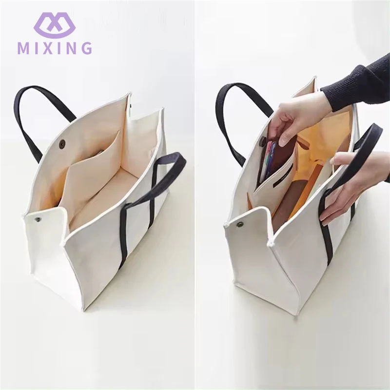 Mixing-toimittajan valmistamassa Plain Canvas -kangaskassissa, jossa on kahvoja käytetty kangasmateriaali tuntuu paksulta, mutta ei raskaalta. Toisin kuin jotkin ohuet kangaspussit, jotka ovat pehmeitä ja velttoisia, se voi säilyttää tietyn jäykkyyden täytön jälkeen, ei väännä esineitä paineen alaisena ja näyttää säännöllisemmältä.